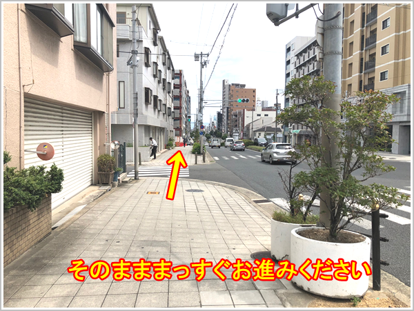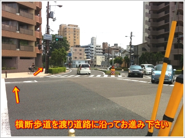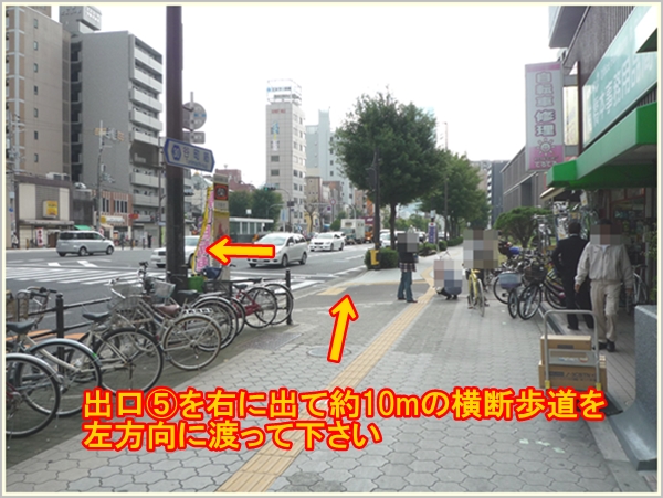 出口Dを右に出てすぐ(約10m)の横断歩道を左方向に渡って下さい。
