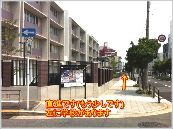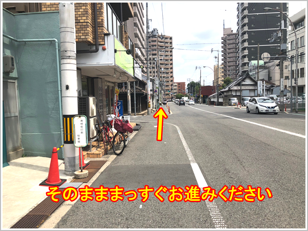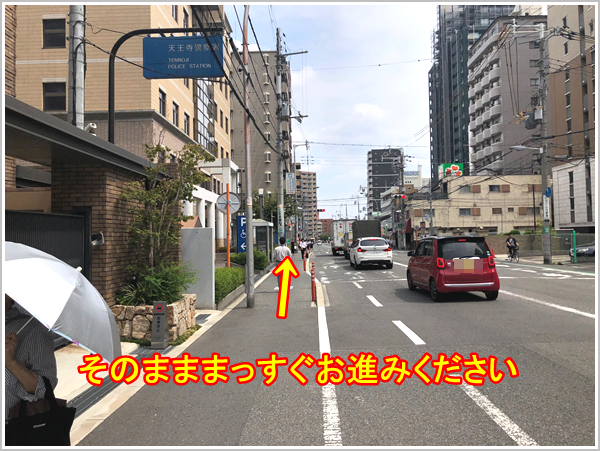 道路に沿ってお進み下さい。20m先左側の建物は天王寺警察です。