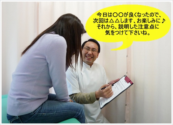最後に、注意事項や予防法、今後の施術計画などを説明して施術は終了です。